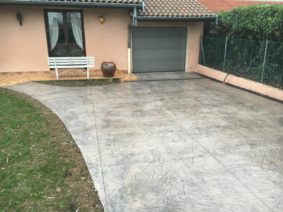 Pour une maison individuelle nous avons construit une cour en béton imprimé de 60m2 avec un accès renforcé pour les voitures. Pour cela nous coulons une épaisseur de béton plus importante que pour une simple allée piétonne.